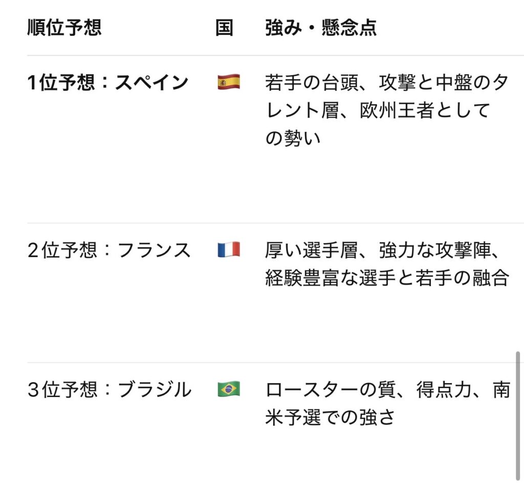 - ドイツ:最近大会では振るわない印象もあるものの、監督起用・準備次第では復権の兆しも。ナゲルスマン監督も「優勝を目指す」と公言。